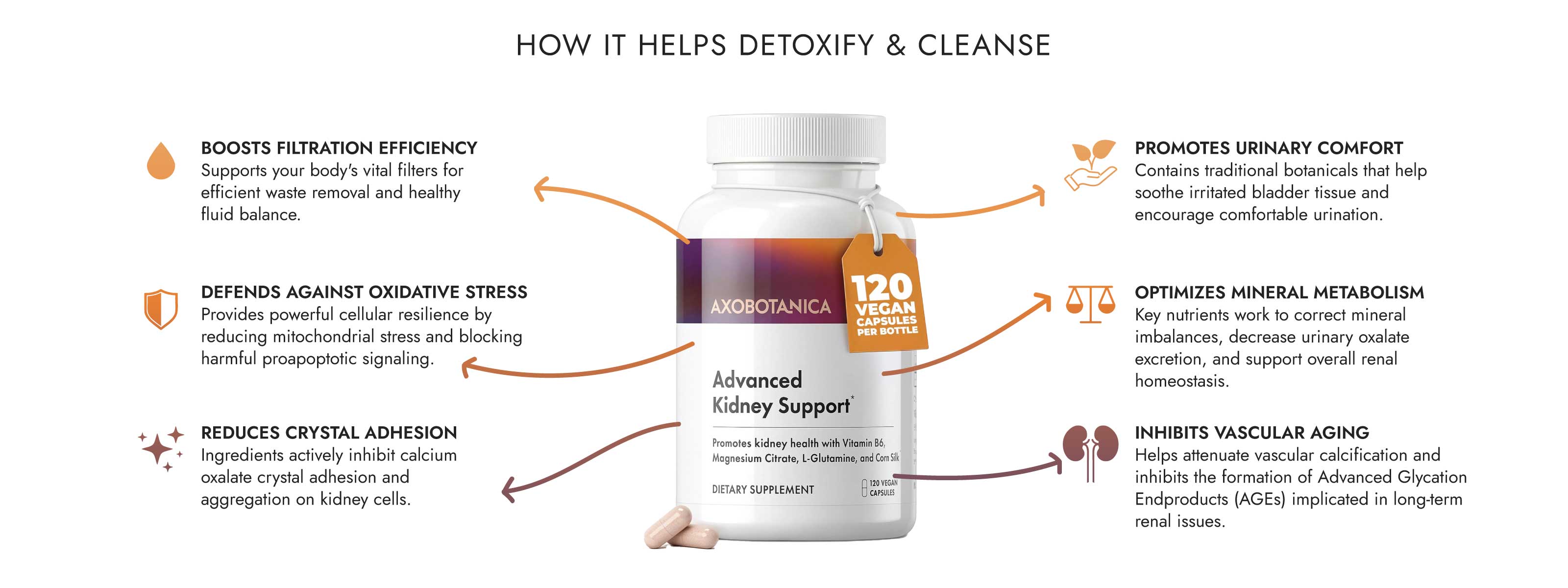 Axobotanica's kidney health supplement is formulated to provide several key benefits for individuals seeking natural support for kidney function. Our unique blend of botanical extracts and essential nutrients is designed to: